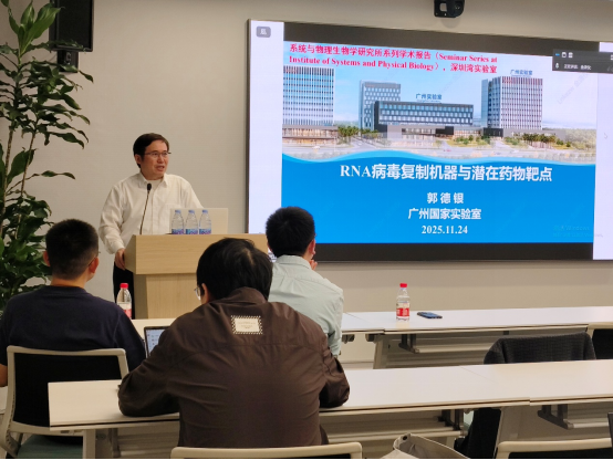应系统与物理生物学研究所邀请,2025年11月24日,广州国家实验室郭德银教授、广州医科大学侯盼盼教授,以及中山大学曹流副教授莅临深圳湾实验室,分别作题为《RNA病毒复制机器与潜在药物靶点》、《呼吸道病毒感染早期上皮细胞脂代谢重塑驱动炎症因子风暴发生》、《抗冠状病毒小分子抑制剂研究》的学术报告。本次报告由深圳湾实验室系统与物理生物学研究所特聘研究员吴超主持,系统与物理生物学研究所及深圳医学科学院多位科研人员现场参会,并与讲者展开深入交流。