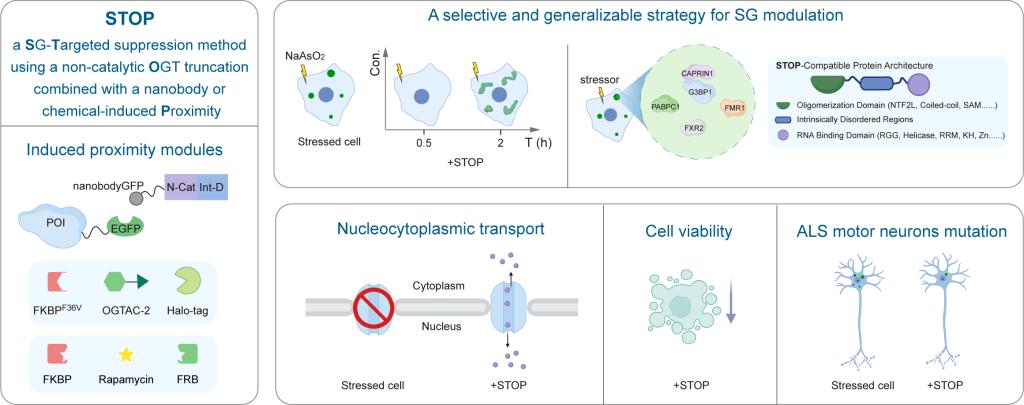 应激颗粒(Stress Granules, SGs)是细胞在氧化损伤、热休克等应激条件下,由RNA与RNA结合蛋白(RBP)通过液-液相分离形成的无膜细胞器(membraneless organelle),其组装与解离的动态平衡直接调控细胞应激响应进程[1]。SG组装异常与神经退行性疾病等多种重大疾病的发生发展密切相关[2],因此开发精准干预SG的工具对于理解SG的动态命运,推动相关疾病的治疗研究具有重要意义。早有研究建立了O-GlcNAc糖基化修饰调控与SG组装的密切联系[3],然而在维持糖基化稳态之外,催化该修饰的唯一O-GlcNAc转移酶(OGT)如何参与到SGs的调控中尚不得知。