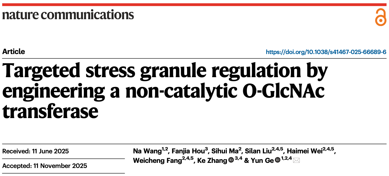 2026年1月7日,深圳湾实验室葛韵课题组在Nature Communications发表了题为“Targeted stress granule regulation by engineering a non-catalytic O-GlcNAc transferase”的研究论文。该工作借助化学诱导邻近策略,意外揭示了OGT通过独立于其糖基转移酶活性的非催化功能实现对SG核心蛋白G3BP1的相分离抑制。将靶向元件与OGT的最小结构域组合(N-cat + Int-D)融合后,可以实现对包括G3BP1在内的众多SG组分蛋白发挥相分离抑制功能。通过改变SG的物质性质,该工具可用来干预SG所参与的众多细胞过程,为SG动态调控机制研究及相关疾病病理机制解析提供了全新视角与核心工具。