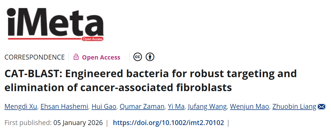 2026年1月5日,深圳湾实验室梁卓斌团队在国际高水平期刊iMeta(IF 33.2)在线发表了题为 “CAT-BLAST: Engineered Bacteria for Robust Targeting and Elimination of Cancer-Associated Fibroblasts” 的研究论文。该研究开发了一种名为 CAT-BLAST 的工程化细菌平台,通过装备特异性“导航系统”和“爆破装置”,能够精准定位并清除肿瘤微环境中的 CAFs,成功瓦解肿瘤的保护性屏障,为攻克实体瘤耐药性提供了全新的解决策略。