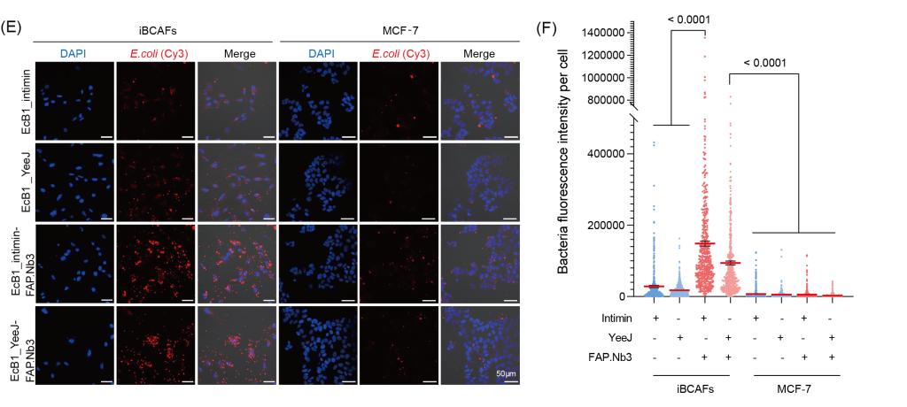 图2 CAT-BLAST体外功能验证。表达FAP纳米抗体的工程菌特异性结合FAP阳性细胞(iBCAFs)