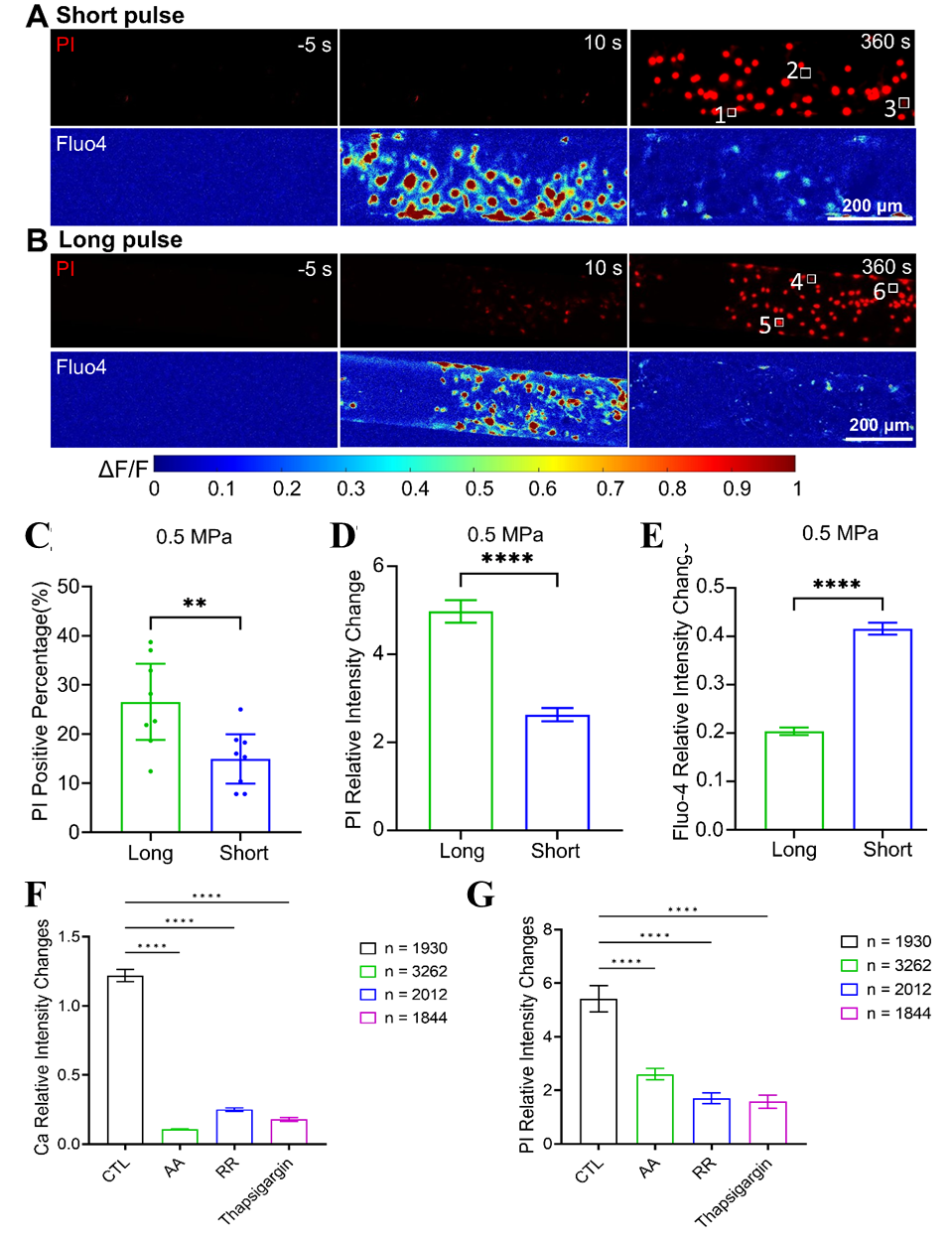 图3. 0.5 MPa声压下短脉冲与长脉冲处理10秒所产生的细胞钙信号与膜穿孔对比以及10秒短脉冲超声诱导细胞钙响应的机制分析和统计