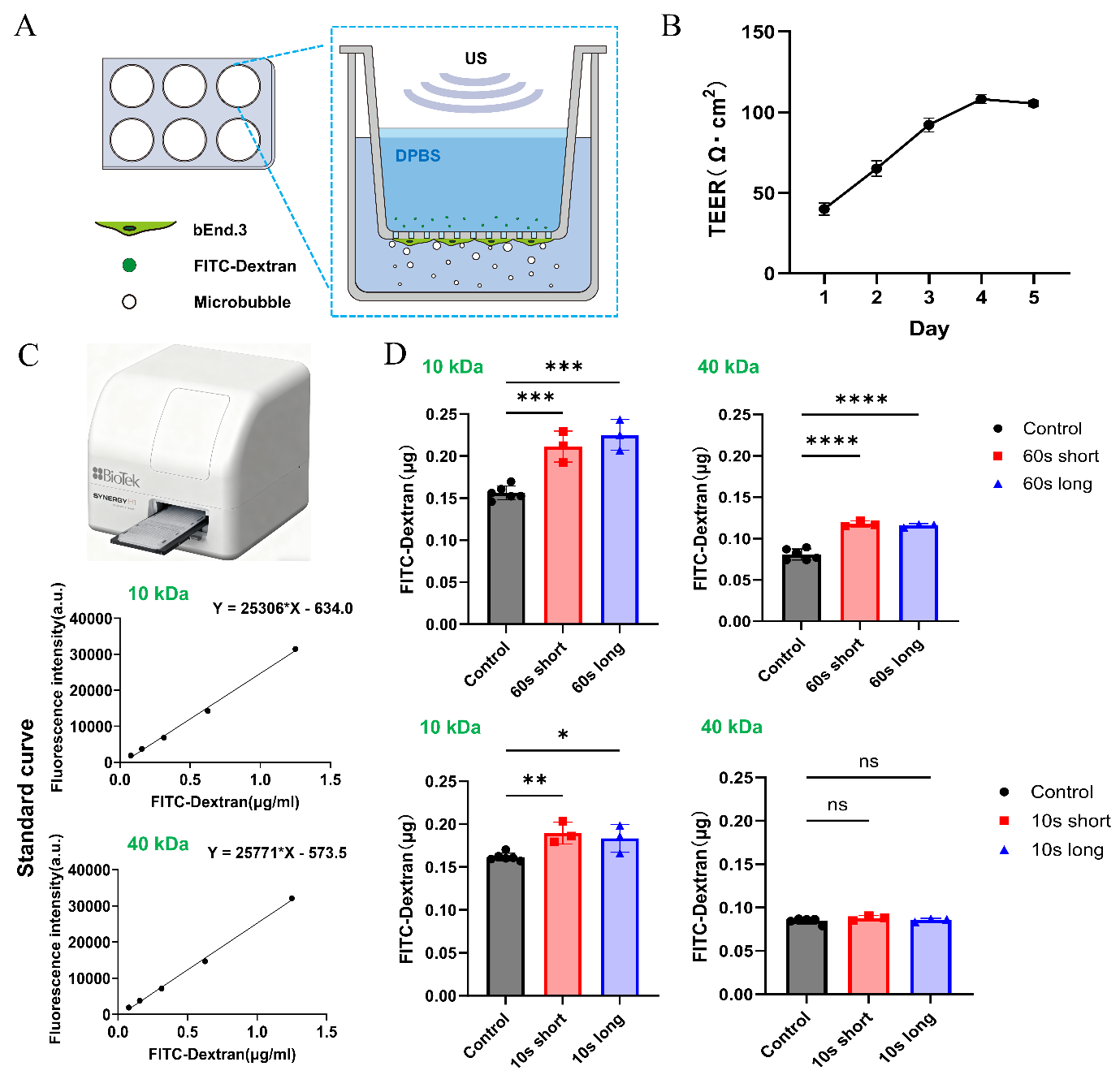 (A)Transwell实验装置示意图。(B)细胞接种后第1天至第5天Transwell中测得的跨内皮电阻值。(C)上方为酶标仪检测示意图,下方为酶标仪测定的10 kDa和40 kDa FITC-葡聚糖标准曲线。(D)不同处理条件下,超声刺激1小时后转运至下室的10 kDa和40 kDa FITC-葡聚糖总量定量结果。此处分别使用了60秒或10秒的短脉冲与长脉冲处理。组间显著性差异采用单因素方差分析确定,每组n = 3–6 transwell孔,* p < 0.05,**p < 0.01,***p < 0.001,****p < 0.0001。