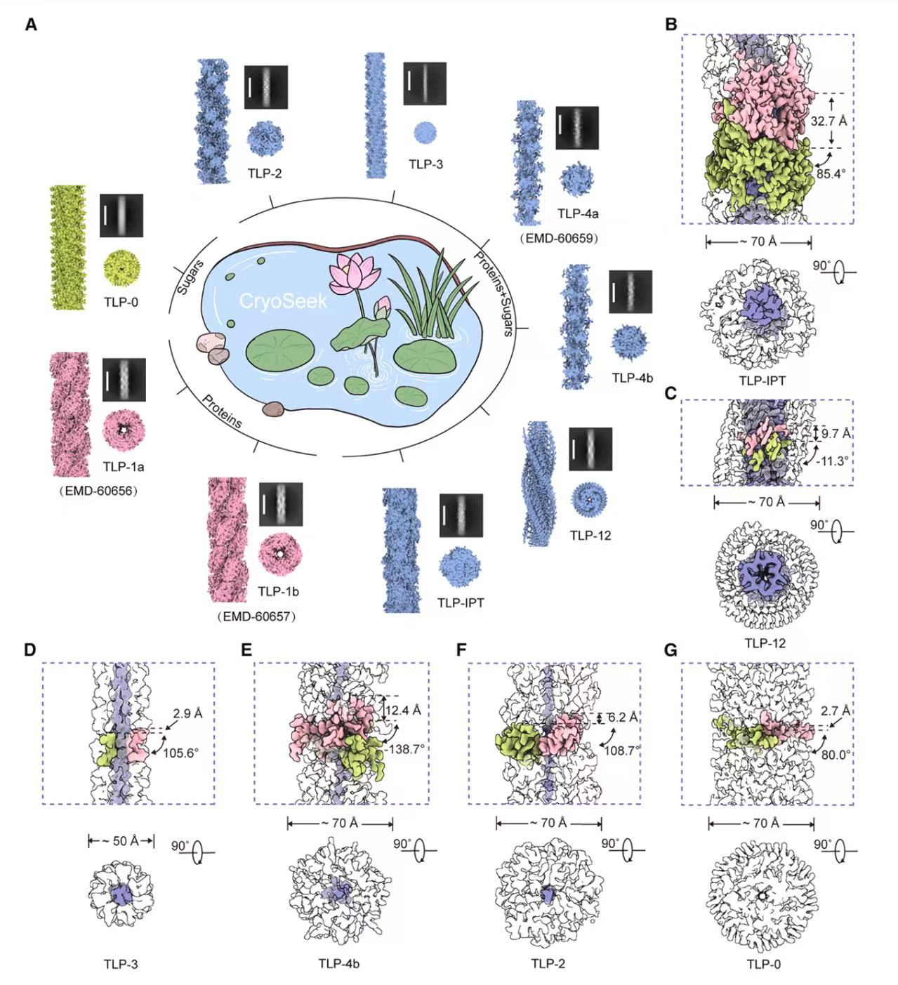 图2. 利用CryoSeek研究策略,在清华荷塘中鉴定出多种纤维结构。(A)目前,在清华荷塘水样中共解析出9种高分辨率纤维结构,依据其蛋白组成可分为三种类型,分别为蛋白纤维(TLP-1a/b)、以蛋白为核心的糖纤维(TLP-2/3/4a/4b/12/IPT)和全部由糖组成的纤维(TLP-0);(B-F)最新报道的5种糖纤维结构的组成以及其螺旋参数。