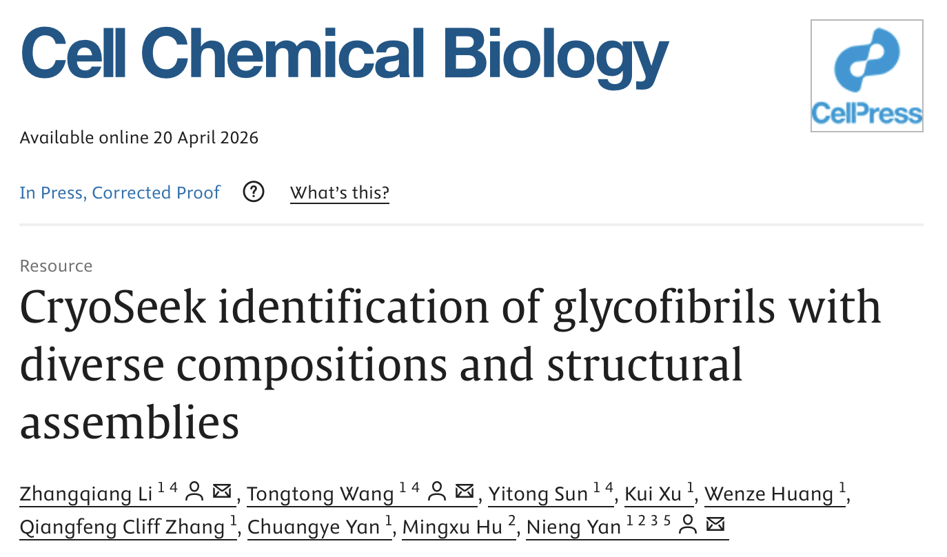 北京时间2026年4月20日,颜宁团队及其合作者在《细胞-化学生物学》(Cell Chemical Biology)杂志发表了题为“通过酷寻鉴定具有多样化学组成和结构组装形式的糖纤维结构”(CryoSeek identification of glycofibrils with diverse compositions and structural assemblies) 的最新研究成果(图1)。延续“荷糖月色”研究计划,研究团队进一步报道了六种全新的糖纤维结构,揭示了糖纤维结构在天然环境中的多样性以及在结构组装过程中的关键作用。