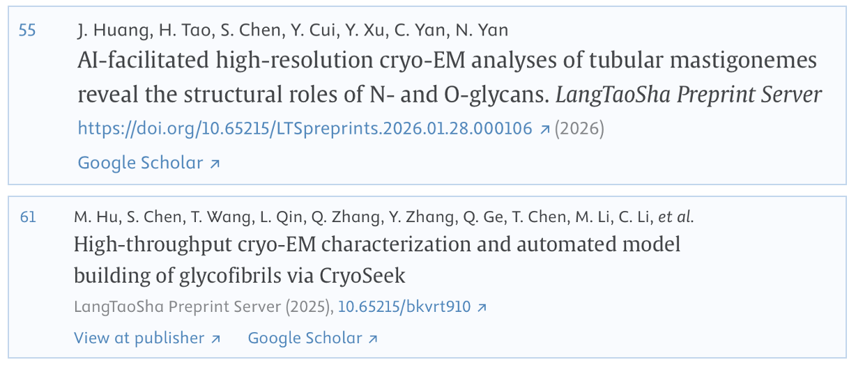 [3] Hu, M., Chen, S., Wang, T., Qin, L., Zhang, Q., Zhang, Y., Ge, Q., Chen, T., Li, M., Li, C., Xu, G., Gui, Q., Li, Z., & Yan, N. (2025). High-throughput cryo-EM characterization and automated model building of glycofibrils via CryoSeek. LangTaoSha Preprint Server. https://doi.org/10.65215/bkvrt910