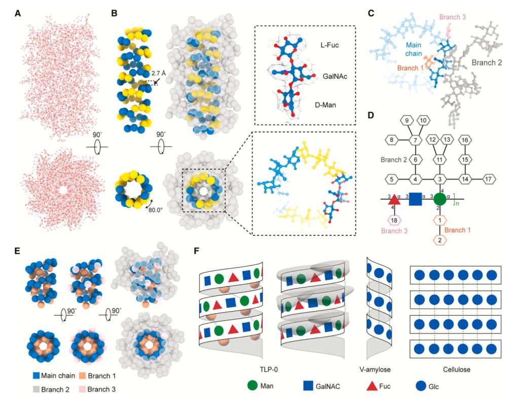 尤为引人注目的是TLP-0的结构,其完全由糖类组成,其中“0”表示不含有蛋白组分。TLP-0的核心是由三糖重复单元以螺旋的形式排列,每个重复单元上连接有约18个额外的糖分子,这些糖链对整体结构的稳定与组装至关重要。同时,TLP-0在分子组成及组装方式上均显著不同于纤维素、淀粉和糖原等经典聚糖,揭示了糖类结构的高度多样性,并表明聚糖可在不依赖蛋白的情况下自发组装形成具有高级有序结构的超分子体系(图3)。
