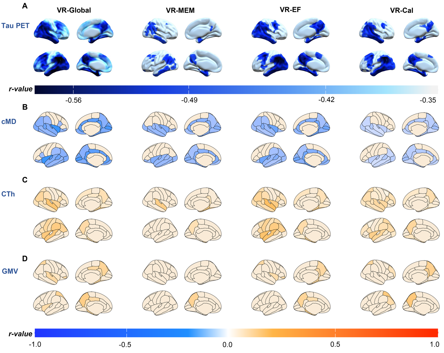 为了探究VR认知评分与大脑特定区域病理变化之间的关联,研究采用了基于体素及感兴趣区域的分析方法。结果显示,较低的VR整体评分与多个关键脑区中更高的tau PET SUVR值显著相关,这些脑区包括内侧颞叶、颞叶各皮层亚区、顶叶、楔前叶以及后扣带回。此外,较低的VR整体评分还与多个脑区(如岛叶、距状裂周围皮层、扣带回及颞叶区域)的皮层平均扩散率(cMD)升高(提示微结构损伤)显著相关,同时也与部分脑区的皮层厚度(CTh)减少和灰质体积(GMV)萎缩有关,尽管后两者涉及的显著脑区相对较少。进一步分析发现,VR执行功能子域评分与整体评分在反映上述病理变化方面表现相当,而其他认知子域的关联则相对较弱(图3)。