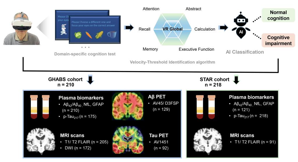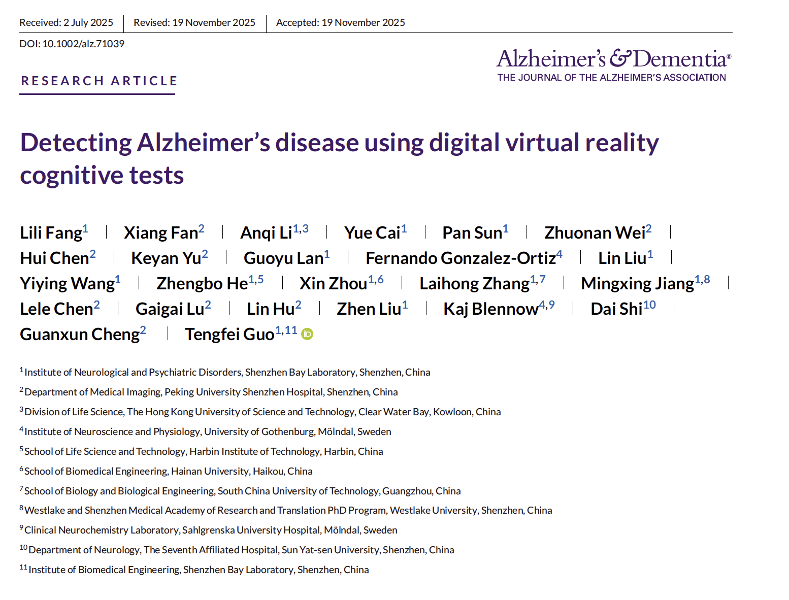 深圳湾实验室神经疾病研究所郭腾飞课题组近期在Alzheimer & Dementia发表了题为“Detecting Alzheimer’s disease using digital virtual reality cognitive tests”的研究论文[1]。该研究基于中国粤港澳地区老年人群队列:大湾区老年脑健康计划(GHABS)与深圳多模态老龄化研究(STAR)系统评估了人工智能辅助虚拟现实数字认知诊断工具(AI-VR)在阿尔茨海默病(Alzheimer’s disease, AD)早期识别中的诊断性能。研究通过与传统临床认知评估进行生物标志物及AD病理特征的组间比较,深入探索了数字化认知标志物与多种体液及影像生物标志物之间的关联,并将其与血浆标志物在区分不同AD病理阶段方面的性能进行了对比。该研究全面揭示了AI-VR认知标志物在大规模社区早期AD筛查中的应用潜力及其与生物标志物、AD关键病理变化之间的系统性联系。