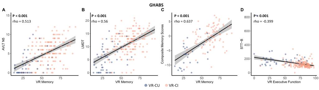 VR记忆功能子域(VR-MEM)评分与以听觉词语学习测试(AVLT N5)、逻辑记忆延迟回忆(LMDT)和复合记忆评分为代表的传统纸质神经心理测验结果均呈显著正相关,验证了其评估记忆功能的良好效度。同时,更高的VR执行功能子域(VR-EF)评分与更短的数字符号转换测试(STT-B)完成时间显著相关,表明其对执行功能同样具备有效的评估能力(图2)。