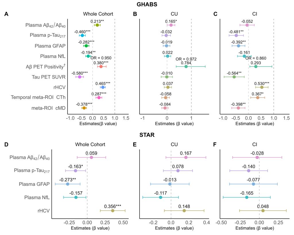 近年来,融合虚拟现实(Virtual reality, VR)与人工智能的沉浸式数字化诊断工具展现出潜力。本研究采用一款基于人工智能辅助虚拟现实数字的可穿戴设备进行认知评估与诊断,通过捕捉受试者眼动轨迹、结合速度阈值算法及人口学信息(如年龄、性别、教育程度)拟合MoCA评分,并利用支持向量机模型生成认知各子领域得分及整体认知诊断[3]。为系统评估该AI-VR工具在AD早期筛查中的价值,本研究从多角度进行分析:比较传统临床诊断分组与AI-VR诊断分组在生物标志物与病理水平上的差异;分析认知子领域得分与AD生物标志物的相关性;并进一步探讨血浆生物标志物(包括p-Tau217、Aβ42/40、GFAP、NfL)与AI-VR认知评分在区分不同AD病理阶段中的效能。结果显示,AI-VR整体认知评分与多种AD相关生物标志物具有显著相关性。在GHABS队列中,较高的VR整体评分与较低的AD病理负担相关,具体表现为:与较低的血浆p-Tau217、GFAP、NfL水平,较低的Aβ PET 阳性率,较低的tau PET SUVR(标准摄取值比)以及较高的皮层平均扩散率(cMD)呈负相关;同时,与较高的血浆Aβ42/40比值、较大的海马体积(rHCV)以及较大的皮层厚度(CTh)呈正相关。在STAR队列中也观察到AI-VR评分与血浆p-Tau217、GFAP及海马体积的一致性关联(图1)。