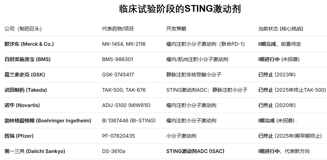 cGAS–STING通路作为细胞内DNA感知的核心机制,在肿瘤免疫监视中扮演着复杂而关键的角色。该通路既能通过激活包括I型干扰素在内的多种信号促进抗肿瘤免疫,也能在特定情况下驱动慢性炎症进而促进肿瘤进展。近年来,针对cGAS–STING通路的激动剂研发已成为肿瘤免疫治疗的热点方向,专利上公开的STING激动性小分子化合物已有上千个,以诺华、默沙东为代表的制药巨头先后开展了几十个临床试验。然而,到今天为止,临床转化尚未取得突破性进展。