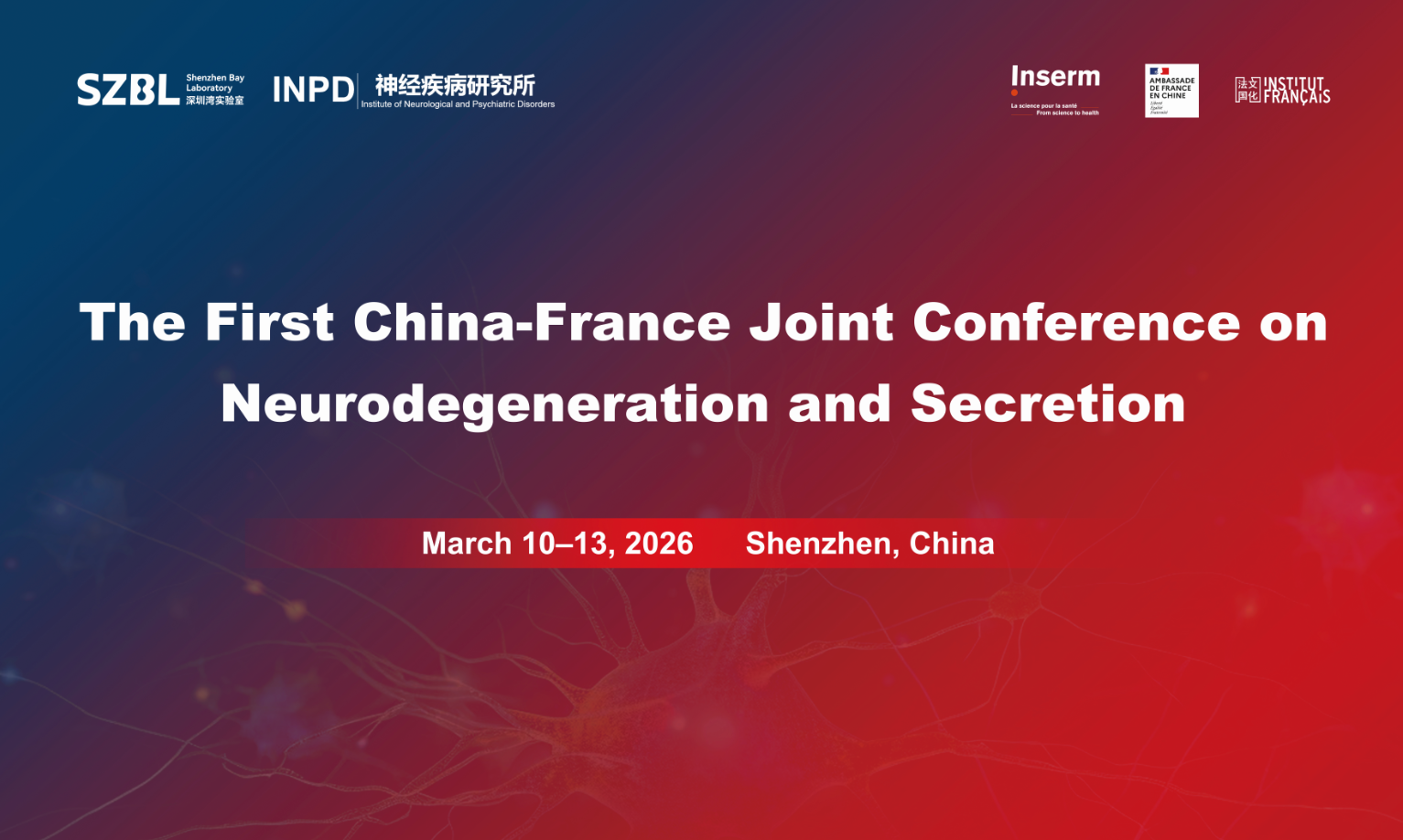The inaugural China-France Joint Conference on Neurodegeneration and Secretion convenes leading international scientists to explore the critical interface between cellular secretion mechanisms and neurodegenerative diseases. Co-organized by Shenzhen Bay Laboratory (China) and Inserm (France), this landmark forum is designed to:Showcase groundbreaking research on membrane trafficking, organelle dysfunction, and unconventional secretion in the context of neurodegeneration.Foster synergistic dialogue between Chinese and French experts across complementary disciplines, from fundamental cell biology to clinical neurology.Identify convergent molecular and cellular pathways that present promising new therapeutic targets.