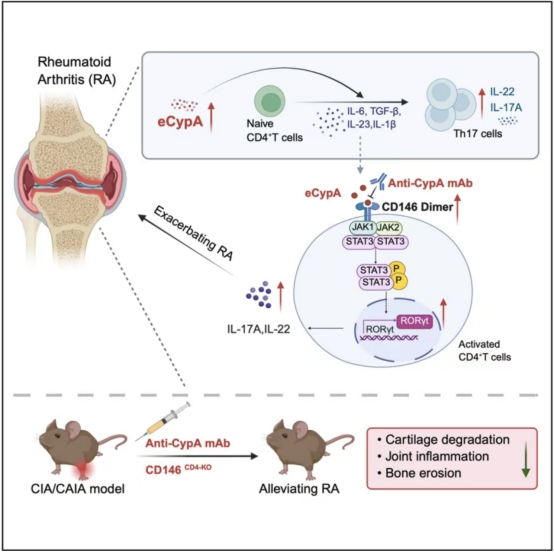 1.发现了细胞外亲环素A的新受体CD146,并解释了亲环素A通过CD146调节TH17/T-reg,进而引发类风湿性关节炎的分子机制。靶向亲环素A的单克隆抗体可以有效治疗类风湿性关节炎。Molecular Therapy, 2025.