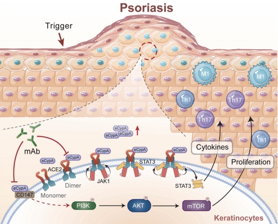 2.发现细胞外亲环素A可以通过结合ACE2和CD147受体促进皮肤病理性增殖及炎症的发生,引发银屑病,而靶向亲环素A的单克隆抗体可以治疗银屑病。Journal of autoimmunity, 2024.
