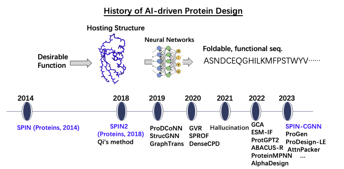 率先开发人工智能驱动的蛋白质序列设计方法SPIN/SPIN2,实现30–34%的序列恢复率(图二)。该成果被国际权威期刊Current Opinion in Chemical Biology(Ovchinnikov与Huang,2021)评价为机器学习应用于蛋白质设计的起点,标志着该领域研究范式从传统基于能量的方法向人工智能驱动的根本性转变。如今这一范式已主导蛋白质设计领域,推动治疗性蛋白与工业酶设计的革命性进展。