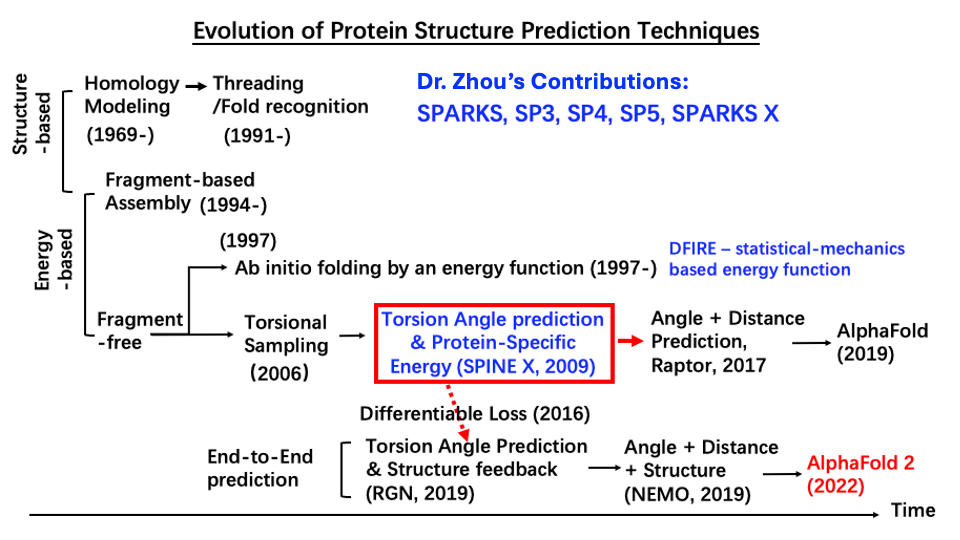 首创利用浅层与深度学习技术实现连续主链二面角预测,使端到端蛋白质结构预测成为可能。这一进展为诺奖工作AlphaFold 2 初步攻克这个分子生物领域长达60年的重大难题奠定了直接基础(图一)。