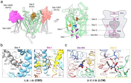 系统性解析靶向Nav通道的药物作用机制:a)单字母编码的药物作用位点命名系统:E表示胞外结构域,S表示选择性离子过滤器,C表示孔道中央腔,G表示胞内激活门,BIG表示胞内激活门下方结构域,F表示侧面窗孔,I表示失活模块IFM结合域,V表示电压感受域;b-c)药物分子的双位点抑制新模式:大麻二酚同时结合Site F和Site I,拉考沙胺同时结合Site C和Site BIG。(来源:Nature Reviews Molecular Cell Biology, 2024;Nature Communications, 2023a,2023b)