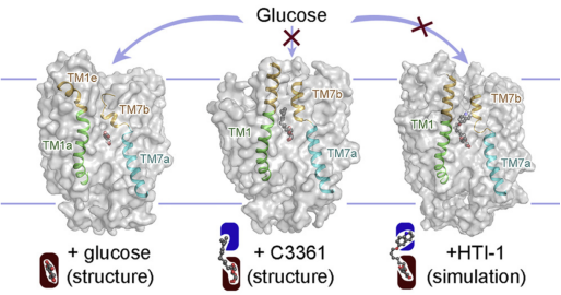 通过结构分析,兼顾底物结合的正构位点和抑制剂结合诱导产生的别构位点,设计出靶向PfHT1“正构+别构”双位点共抑制剂 (来源:Cell, 2020)
