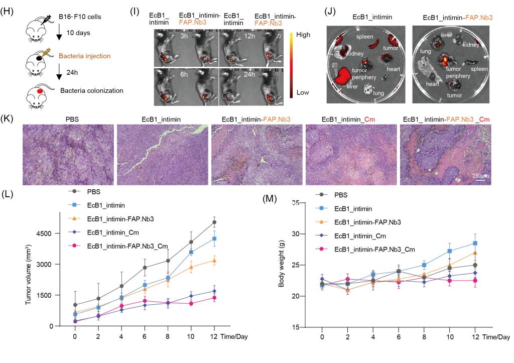图3 CAT-BLAST 在难治性黑色素瘤模型中的靶向定植与治疗效果。 (H) B16-F10 黑色素瘤模型的瘤内注射治疗示意图 ;(I) 不同时间节点的小鼠活体成像显示,FAP 靶向工程菌(EcB1_intimin-FAP.Nb3)在 B16-F10 肿瘤中能更长时间定植,而非靶向菌株迅速扩散 ;(J) 小鼠主要器官的体外成像进一步证实了 FAP 靶向工程菌在肿瘤中的强效定植与富集 ;(K) H&E 染色结果显示,CAT-BLAST 处理组的 B16-F10 肿瘤组织存在明显的破坏与坏死 ;(L-M) 肿瘤生长曲线 (L) 和小鼠体重曲线 (M) 表明,CAT-BLAST 在 B16-F10 模型中显著抑制了肿瘤生长,且小鼠体重保持稳定,表现出良好的耐受性
