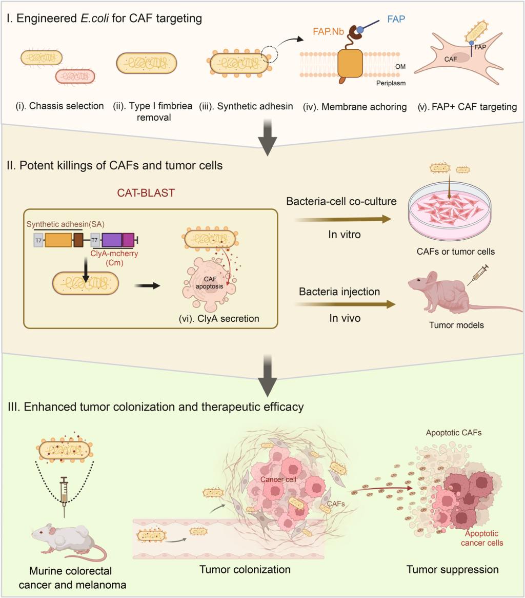 图1 CAT-BLAST 平台工作原理示意图。 (I) 工程化大肠杆菌构建:选用安全底盘(敲除I型菌毛)并装备FAP特异性合成黏附素(SA);(II) 精准杀伤机制:细菌通过SA特异性定植于FAP阳性CAF,分泌ClyA毒素诱导CAF凋亡;(III) 治疗效果:在体内通过清除CAF屏障并产生旁观者效应,高效抑制肿瘤生长