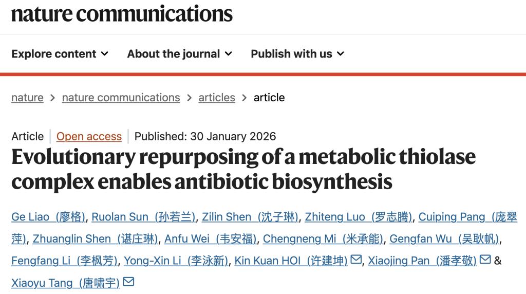 2026年1月31日,深圳湾实验室化学生物学研究所唐啸宇课题组与合作者在国际期刊Nature Communications发表题为“Evolutionary repurposing of a metabolic thiolase complex enables antibiotic biosynthesis”的研究论文。