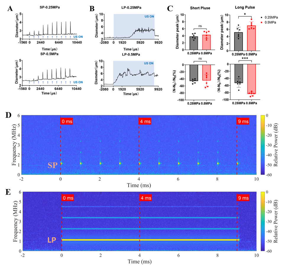 (A) 在0.25 MPa和0.50 MPa声压下,连续10个短脉冲(SP)暴露期间微泡体积加权直径随时间的变化。蓝色箭头表示每个超声脉冲的施加时刻。(B) 在0.25 MPa和0.50 MPa声压下,单个长脉冲暴露期间微泡体积加权直径随时间的变化。阴影区域表示超声暴露时段。(C) 短脉冲模式与长脉冲模式下,0.25 MPa与0.5 MPa之间相对气泡数量变化及体积加权直径峰值的统计分析与比较。采用t test检验,每组N = 6个独立芯片实验。在0.5 MPa声压下,短脉冲(D)和长脉冲(E)的被动空化检测(PCD)测量及频谱分析。结果显示微泡动力学主要处于稳态空化。