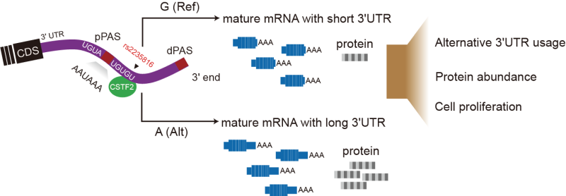 选择性多聚腺苷化(APA)是基因转录后调控的重要过程。通过利用不用的poly(A)位点,基因能够调节其3'非翻译区(3'UTR)的长度,使其缩短或延长,从而影响的多种顺式调控元件的下游调控,如microRNA或RNA结合蛋白(RBP)。APA可以影响靶基因的翻译、基因产物的定位以及蛋白-蛋白相互作用,而不受mRNA表达水平或剪接的影响。在人类原发性癌症和癌细胞系中经常观察到APA的失调,这表明它可能参与癌症的发病机制。尽管已有研究指出3'UTR相关联的遗传变异与多种复杂疾病有关[1],但与癌症易感基因相关的APA调控机制在很大程度上是未知的。