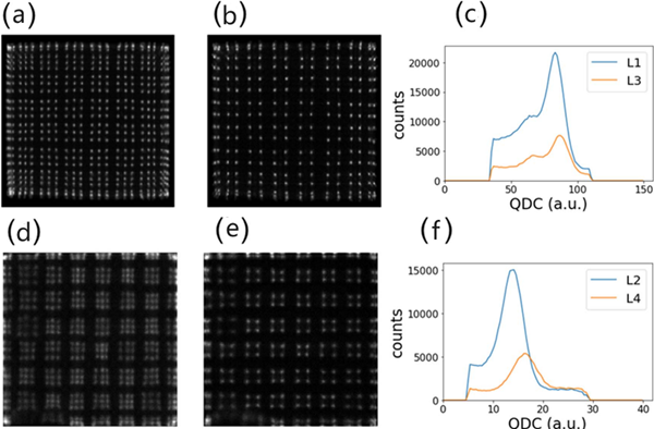 图4 基于同种晶体不同层(a, b, c为两层LYSO晶体结果;d, e, f为两层BGO晶体结果)中闪烁光分布的特征,使用CNN成功将同种晶体不同层中的伽马事件进行区分,得到晶体解码图和能谱。
