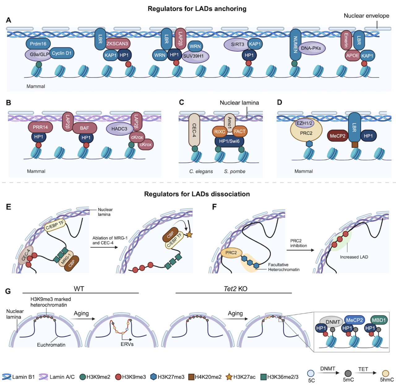 组蛋白修饰和“连接蛋白”将染色质锚定到核周边并抑制基因表达。A:在哺乳动物中,H3K9me2/3修饰的染色质与lamin B结合;B:在哺乳动物中,H3K9me2/3修饰的染色质与lamin A/C结合;C:在秀丽隐杆线虫和酵母中,H3K9me2/3修饰的染色质与核纤层结合;D:在哺乳动物中,H3K27me3和H4K20me2修饰的染色质与lamin B结合。组蛋白修饰及相关蛋白调控染色质从核周解离并促进基因表达;E:在秀丽隐杆线虫中,敲除MRG-1或者降低H3K36me2/3导致异染色质从核周解离;F:PRC2复合物抑制新生LADs,防止H3K9me3在染色质上扩散;G:TET2维持细胞衰老过程中ERV等染色质区域从核周的解离与表达。