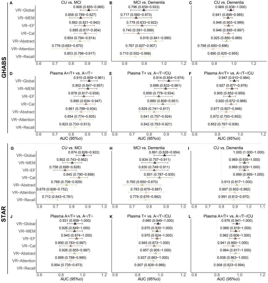 VR整体认知评分在区分不同临床与生物标志物分组方面表现优异。在GHABS队列中,该评分能有效鉴别认知正常、轻度认知障碍、与痴呆个体,其受试者工作特征曲线下面积(AUC)介于0.796至0.969之间(图4)。尤其重要的是,VR整体评分能以高精度区分不同阶段的血浆生物标志物阴阳性(AUC: 0.91)(图4),并能够准确识别出认知正常个体中血浆p-Tau217阳性和Aβ42/40阳性的个体。此外,VR记忆功能、执行功能和计算功能(VR-Cal)等子域评分也展现出良好的分类能力。上述结果在独立验证队列(STAR队列)中得到成功复现。