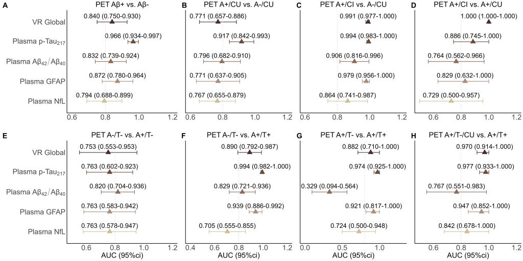 最后,研究进一步比较了VR整体认知评分与多种血浆生物标志物在识别脑内Aβ PET及tau PET阳性病理方面的诊断效能(图5)。结果显示,尽管血浆p-Tau217表现最佳(AUCs: 0.763-0.994),但VR整体认知评分(AUCs: 0.753-1.000)与其表现相近甚至略优,且明显优于血浆Aβ42/40、GFAP及NfL等生物标志物。