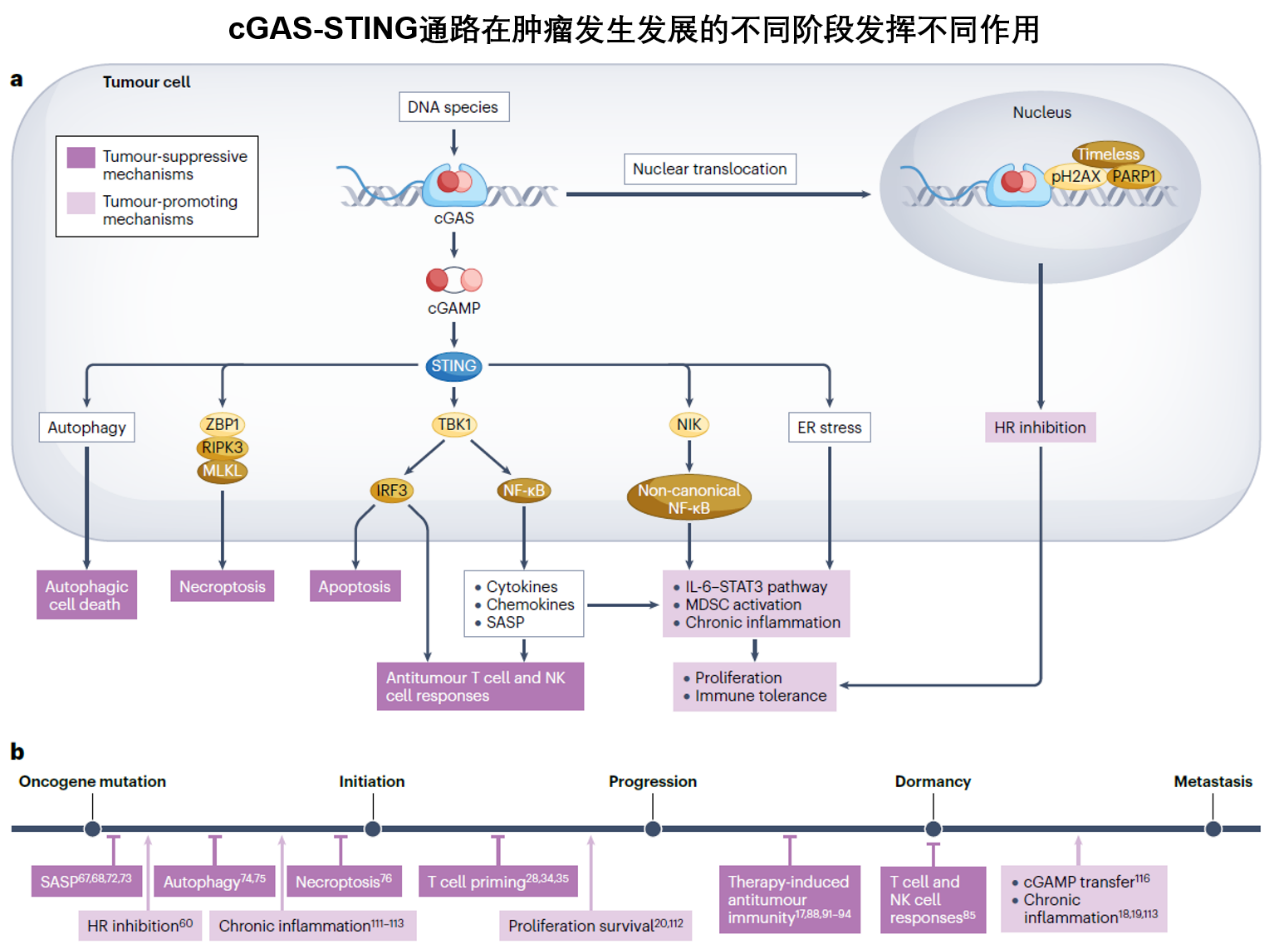 本文的特色之二,也是与以往的cGAS-STING通路的综述性文章最大的区别,通过大量案例,明确指出了在肿瘤发生、发展和转移等各个阶段,cGAS-STING通路激活后所介导的不同结果。例如,在肿瘤起始阶段,cGAS–STING通路在经典癌症生物学所定义的两个阻碍肿瘤发生的最后节点—senescence和replicative crisis—中所发挥的关键性抗肿瘤作用。在肿瘤进展期,慢性或异常的cGAS–STING激活可能通过非经典NF-κB信号、IL-6–STAT3轴、ER Stress等机制促进肿瘤生长和转移。