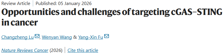 2026年1月5日,深圳湾实验室肿瘤研究所的卢长征研究员、清华大学基础医学院的王文彦助理研究员和傅阳心教授,在Nature Reviews Cancer上发表题为“Opportunities and challenges of targeting cGAS–STING in cancer”的综述文章,系统阐述了cGAS–STING通路在肿瘤发生、发展、转移与治疗中的双重作用,并深入探讨了其作为治疗靶点的潜力与当前困境。