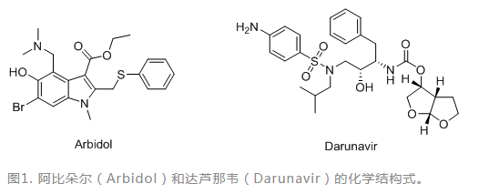 图1. 阿比朵尔(Arbidol)和达芦那韦(Darunavir)的化学结构式。