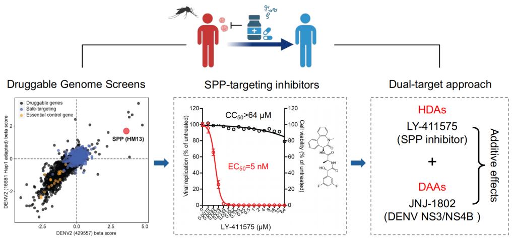 3.筛选并鉴定SPP为黄病毒感染所必需的关键宿主因子,并证明靶向SPP的小分子化合物具有显著的广谱抗黄病毒活性。